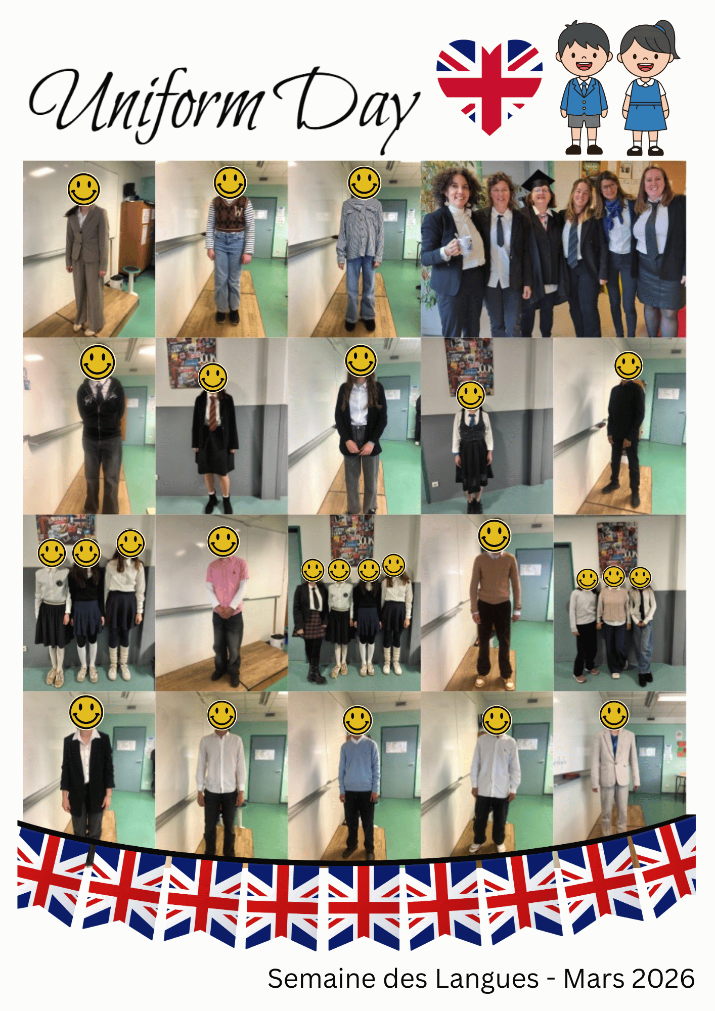 Pour la journée britannique de la semaine des langues, l'équipe d'anglais avait proposé aux élèves et professeurs de venir habiller d'une tenue inspirée d'uniforme scolaire typique qu'on retrouve partout dans le rues du Royaume-Uni.