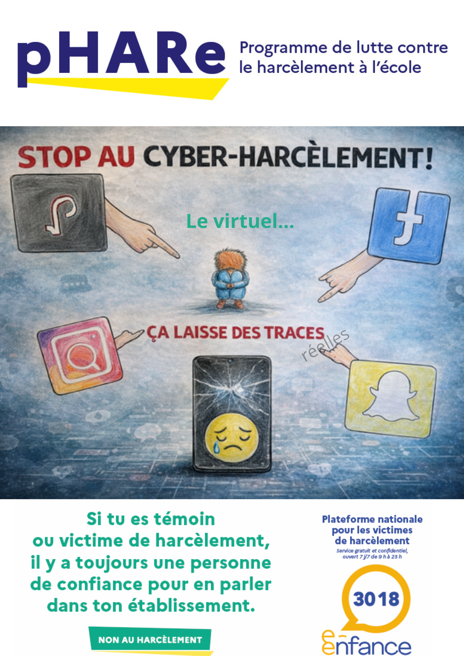 L'affiche sur la sensibilisation à l'usage des réseaux et aux risquex de cyber-harcèlement réalisée par Louis, Timothée, Merlin et Léon a remporté le plus de voix ( 91 voix).